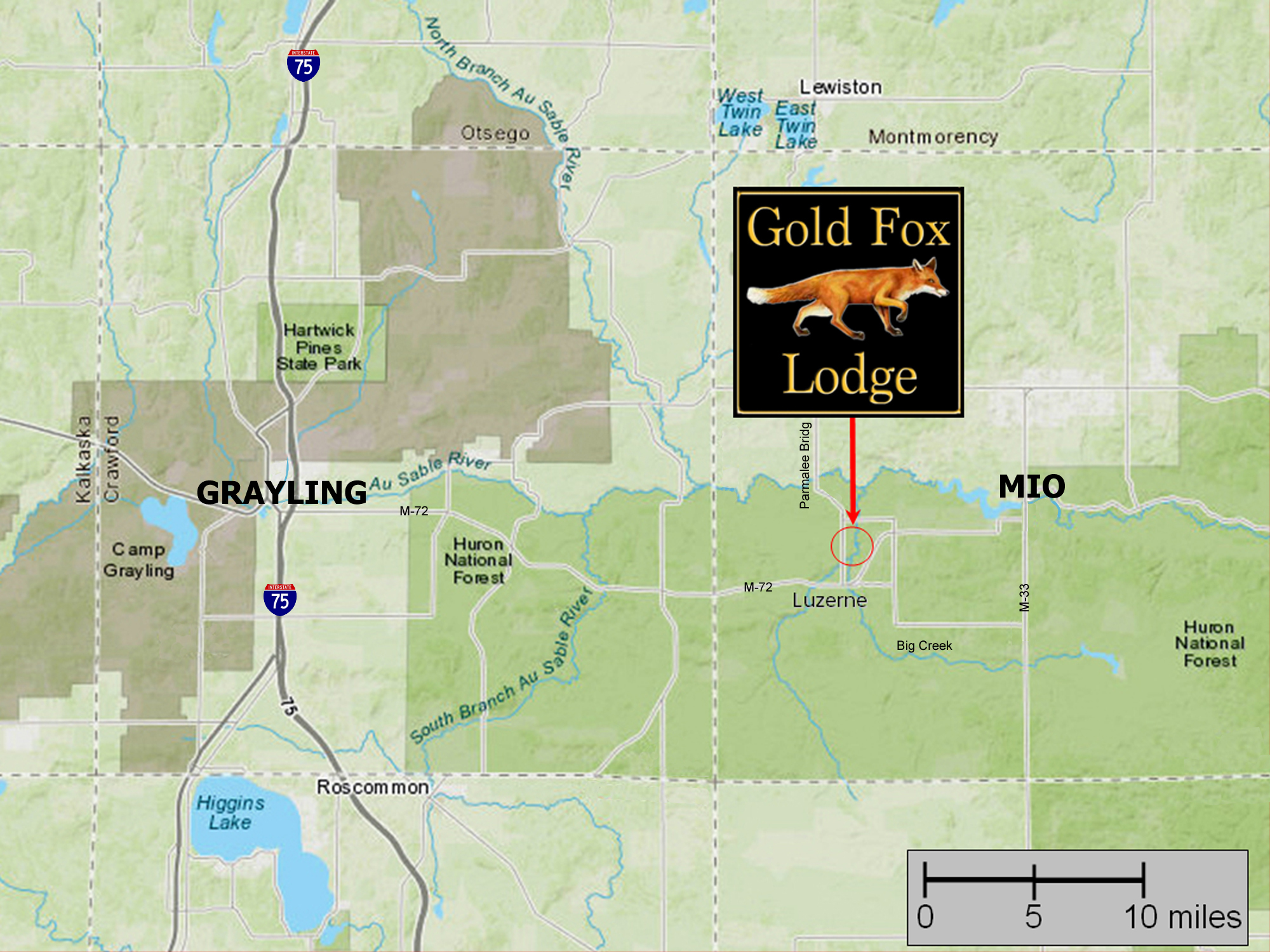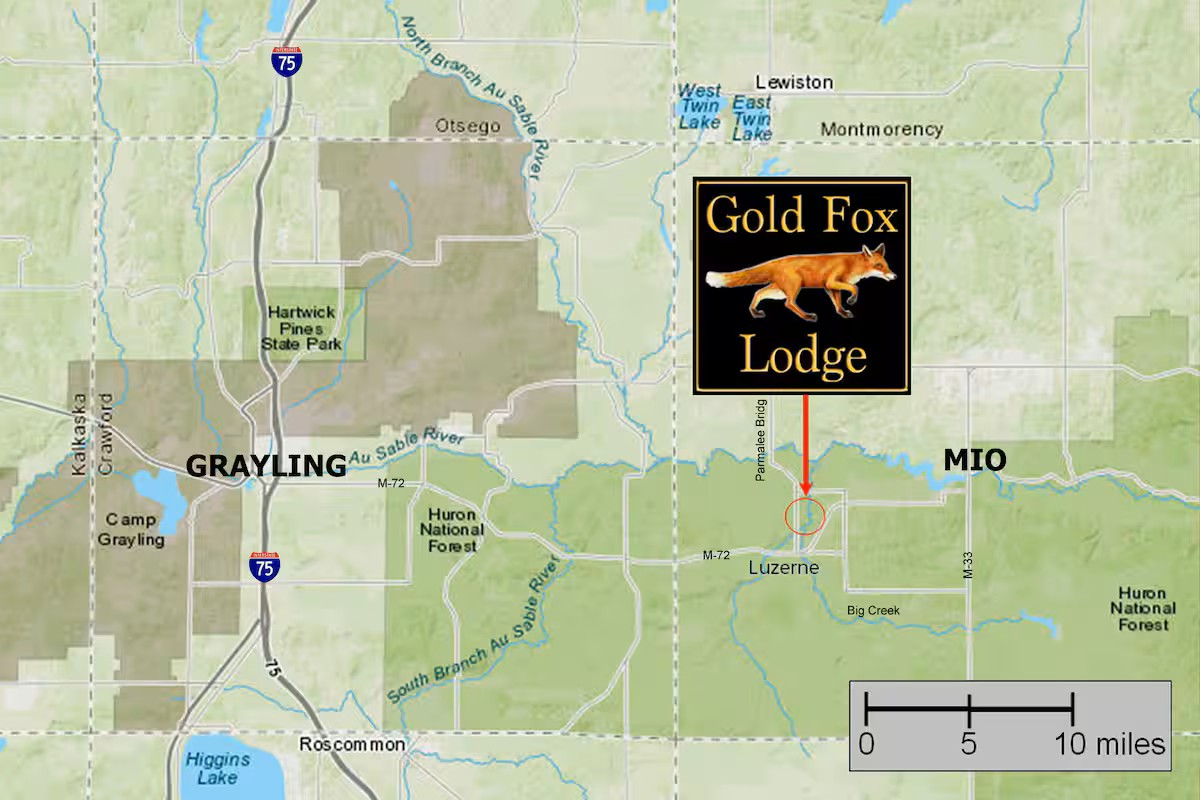 Close to hiking/ATV trails, mountain bike single track trails, horseback riding and canoe/kayak liveries, Gold Fox Lodge is ideally located. While only a short drive to Traverse City, Boyne Mountain, and Grayling, shopping and dinner out are also easily accessible.